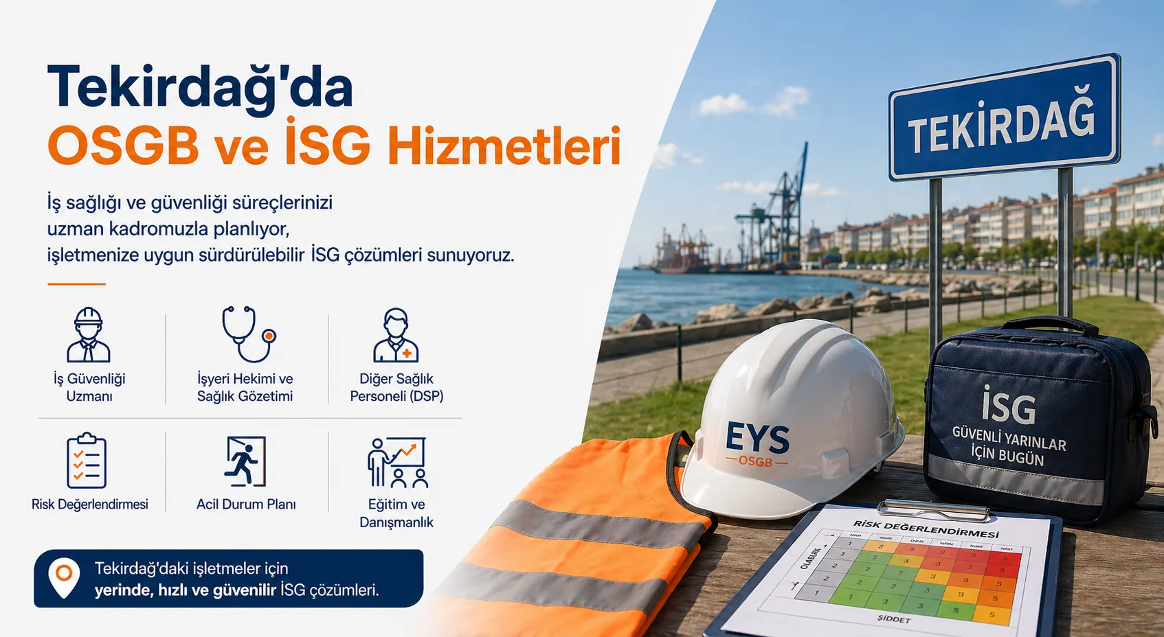 EYS OSGB, uygun kapsamlı Tekirdağ işletmeleri için iş güvenliği uzmanı, işyeri hekimi, DSP ve bağlı İSG hizmetlerini planlar. Yetki belgesi, kurumsal bilgiler ve referanslar hizmet değerlendirmesi öncesinde incelenebilir.